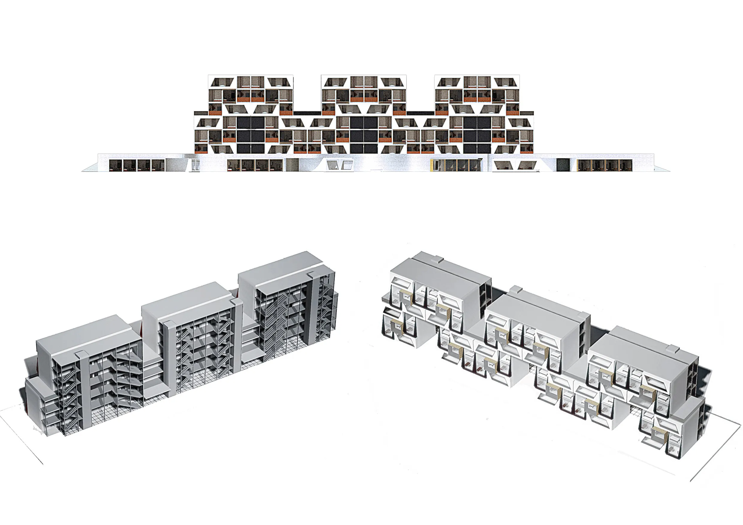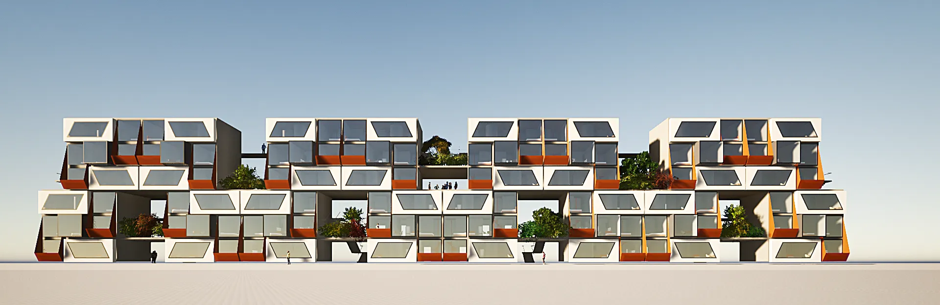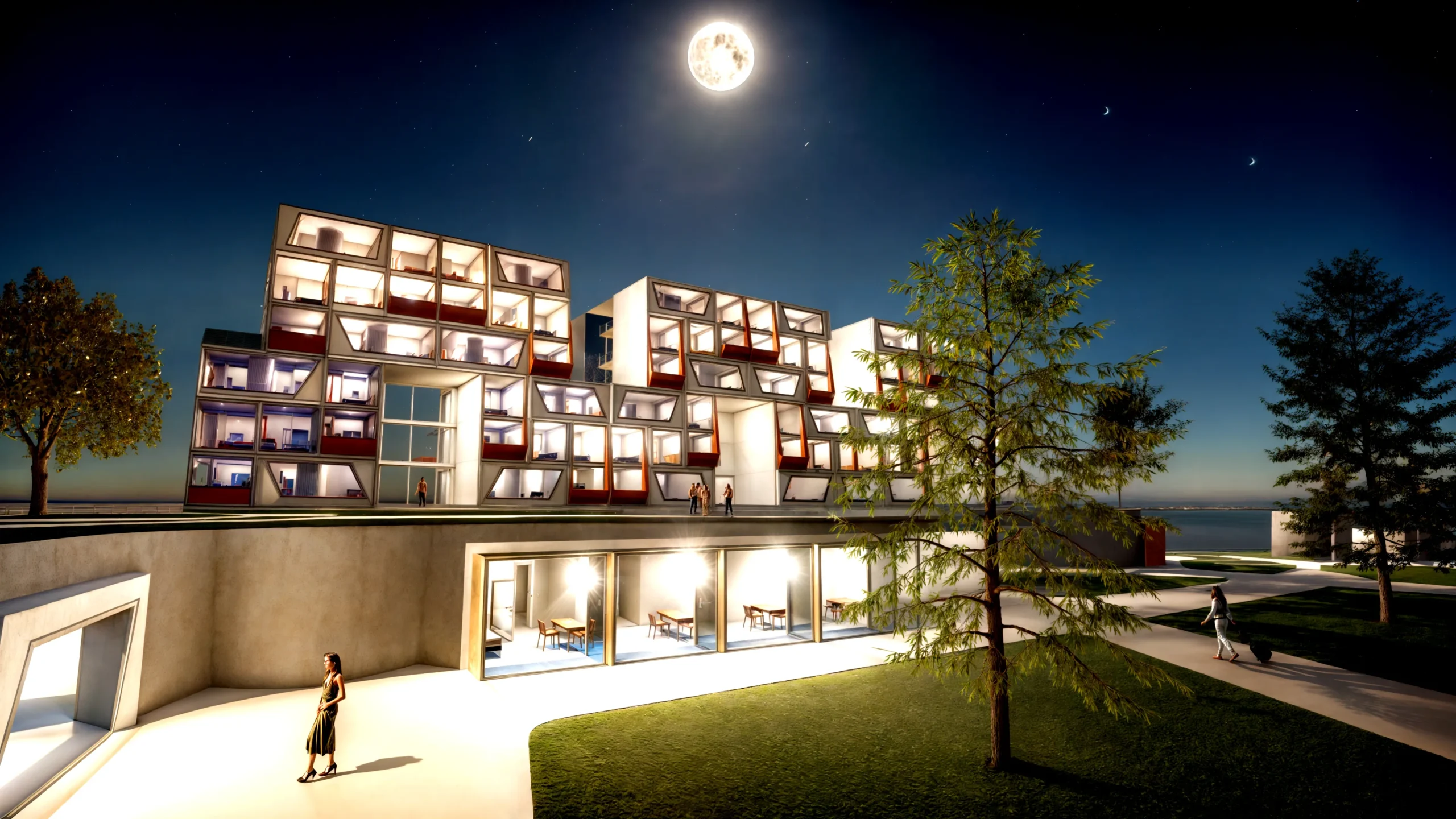 Σαν στιβαρή σκακιέρα πάνω από τις πτέρυγες, βρίσκονται τρεις επιπλέον τριώροφες μονάδες. Αυτές διατάσσονται στρατηγικά ώστε να δημιουργούν μικρούς ταρατσόκηπους, σε ένα διαδραστικό παιχνίδι φωτός και σκιάς στους ενδιάμεσους χώρους.