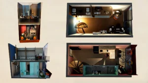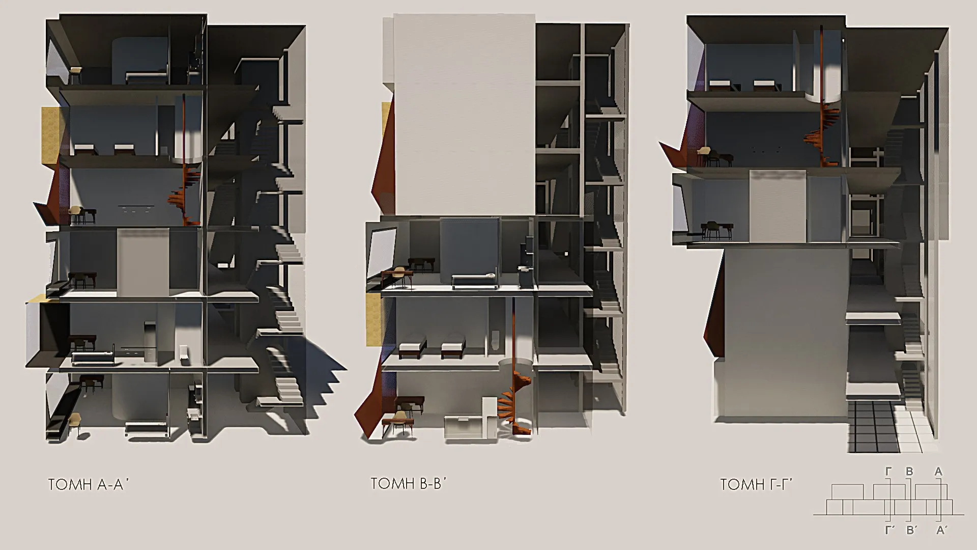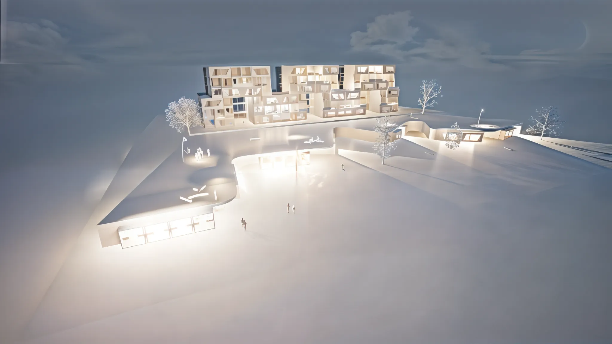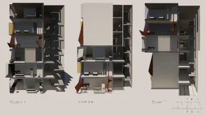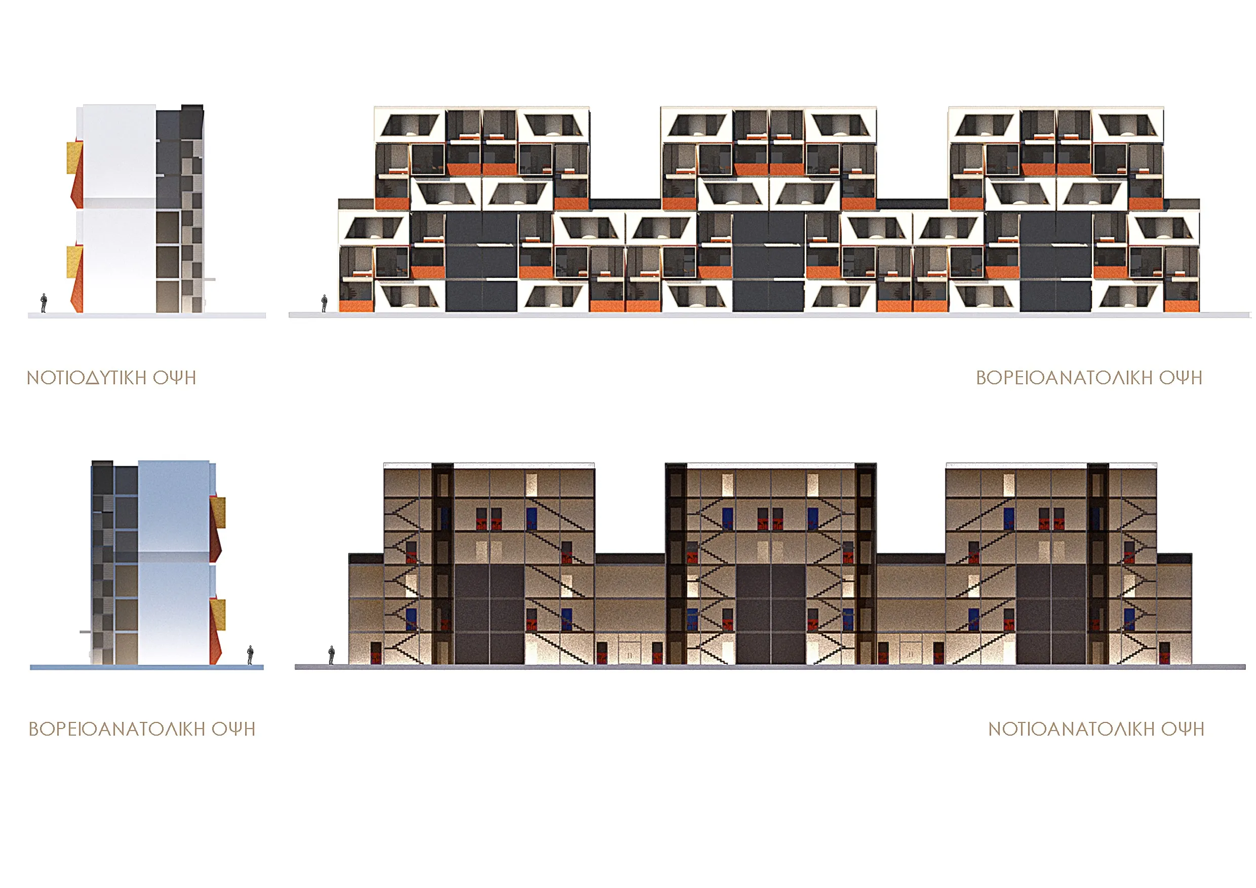 Σαν στιβαρή σκακιέρα πάνω από τις πτέρυγες, βρίσκονται τρεις επιπλέον τριώροφες μονάδες. Αυτές διατάσσονται στρατηγικά ώστε να δημιουργούν μικρούς ταρατσόκηπους, σε ένα διαδραστικό παιχνίδι φωτός και σκιάς στους ενδιάμεσους χώρους.