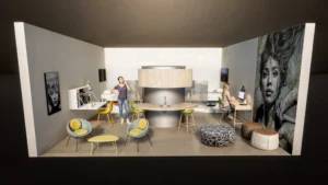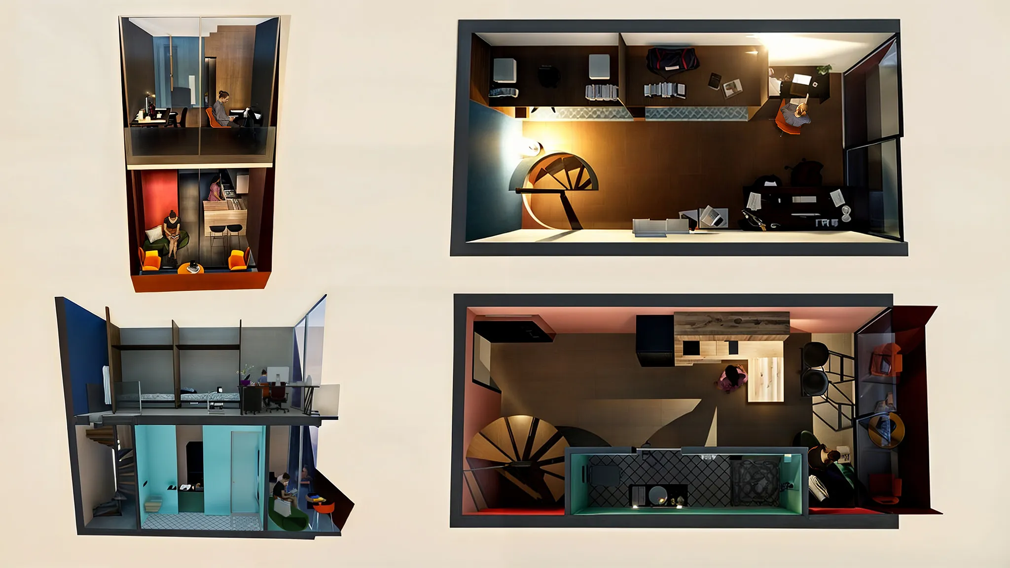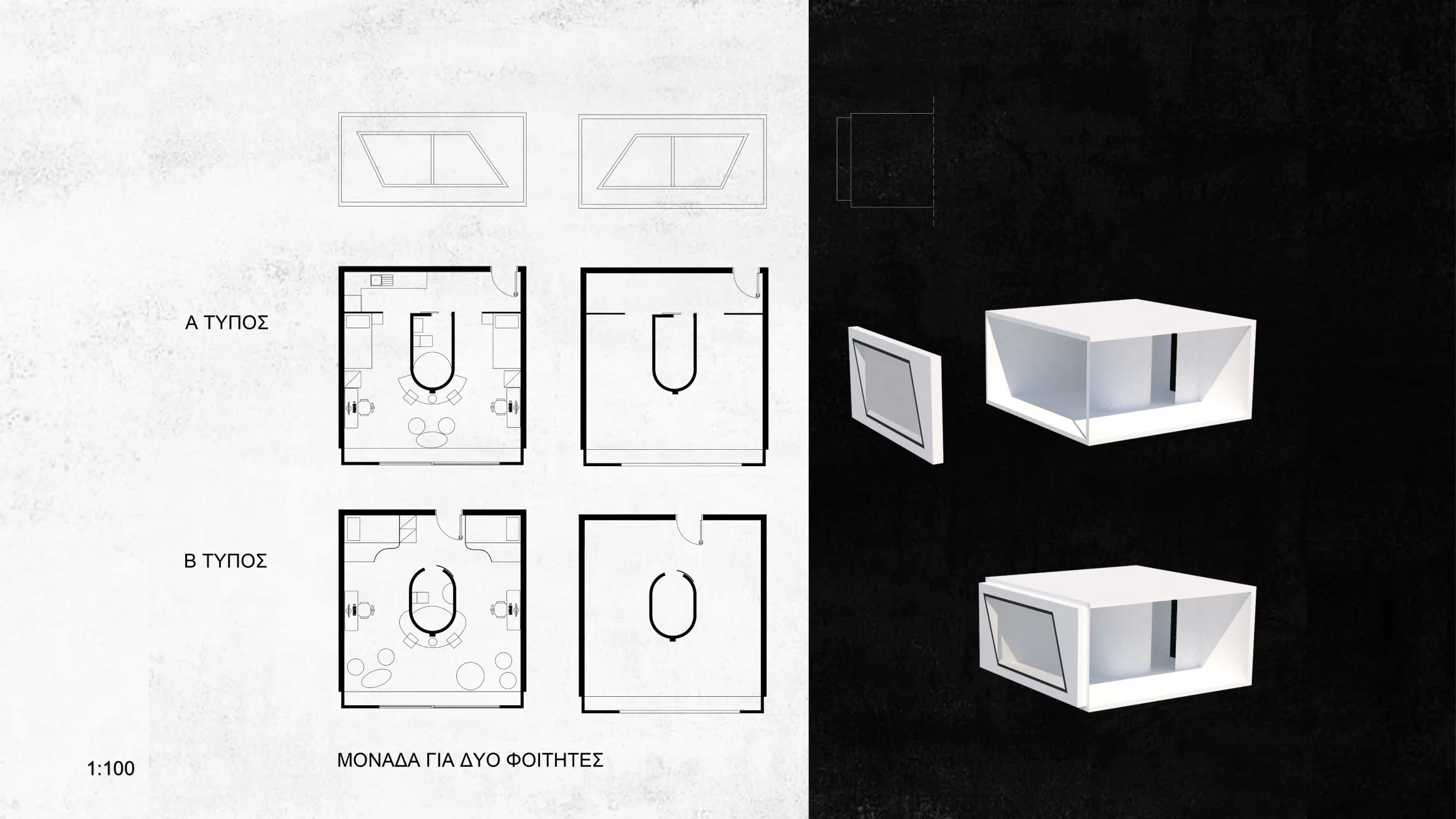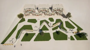 Το αρχιτεκτονικό συγκρότημα φοιτητικών εστιών σχεδιάζεται με στόχο την αρμονική συνύπαρξη λειτουργικότητας, αισθητικής και κοινωνικής αλληλεπίδρασης, ενσωματώνοντας τις ανάγκες των φοιτητών σε ένα δυναμικό περιβάλλον που αναδεικνύει την ισορροπία μεταξύ δημόσιου και ιδιωτικού χώρου.