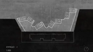 Το ισόγειο αναπτύσσεται ως ένας ευρύς, ανεξάρτητος εν μέρει υπόσκαφος χώρος που φιλοξενεί πολλές αυτόνομες ομάδες δωματίων. Οι όγκοι είναι τοποθετημένοι περιμετρικά, δημιουργώντας έναν κεντρικό, ανοικτό χώρο ο οποίος λειτουργεί ως κόμβος συνάντησης και δραστηριοτήτων.
