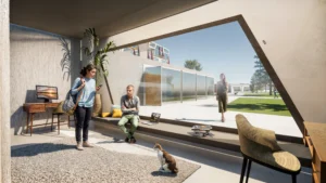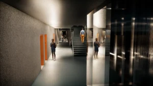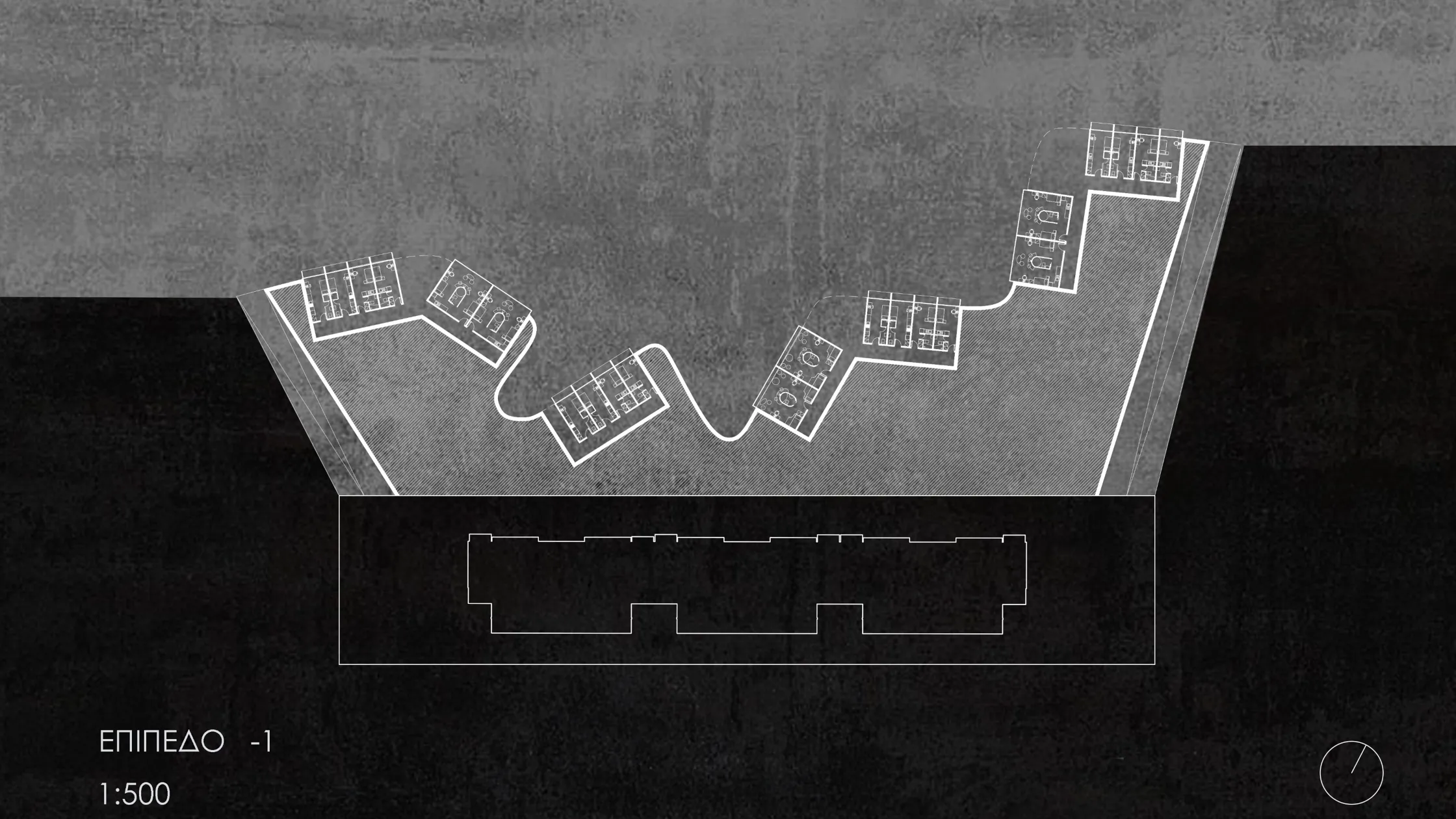 Οι πτέρυγες συνδέονται μεταξύ τους με διάφανους υπερυψωμένους διαδρόμους, που προσφέρουν απρόσκοπτη θέα στον περιβάλλοντα χώρο. Μπροστά τους, δημιουργείται ένας εκτεταμένος χώρος με παρτέρια, σχεδιασμένα για να λειτουργούν ως πράσινες οάσεις που ενισχύουν την αίσθηση ηρεμίας.