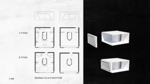 Η συνολική σύνθεση εκτείνεται σε δύο επίπεδα, διαρθρωμένα με αυστηρή γεωμετρία και καθαρότητα στις γραμμές.
