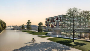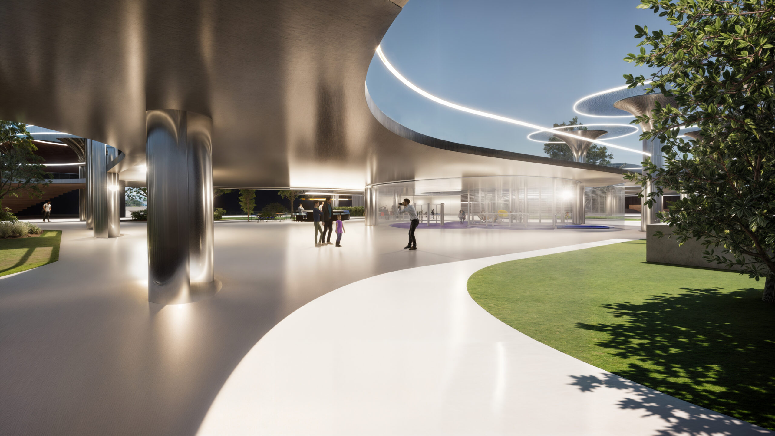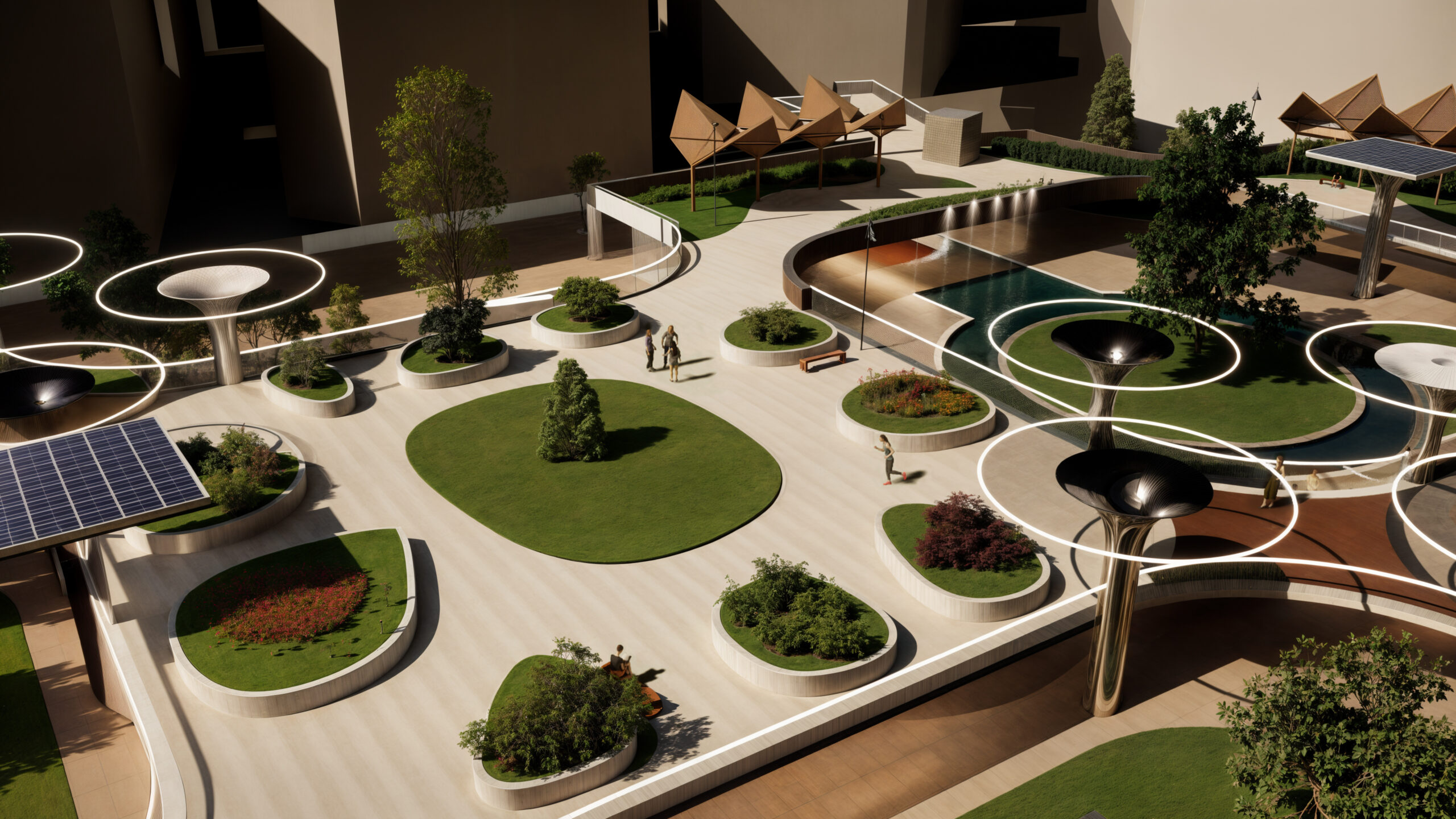 Το πρώτο επίπεδο θα λειτουργεί ως ζωντανός αστικός θύλακας με χώρους πρασίνου, καθιστικά, παιδική χαρά και σημεία πολιτιστικής έκφρασης.